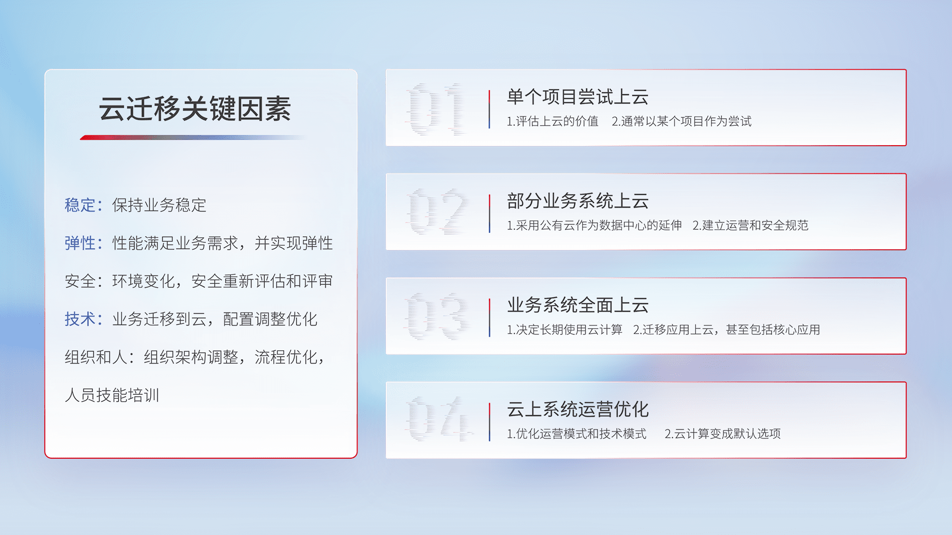 结合实际业务,,从规划设计、、云平台选型、、云原生改造、、、、数据迁移、、、集成交付,,,迁移全过程为客户识别最佳上云路径,,,,做好风险识别管理,,设计网络架构、、、、身份权限、、、安全审计合规、、、、操作审计、、、、日志审计、、、、监控告警策略、、、多站点容灾设计等,,,,对云上基础设施进行整体规划,,,提升IT治理水平,,以满足弹性、、、、高可用、、、高性能的需求。。。。