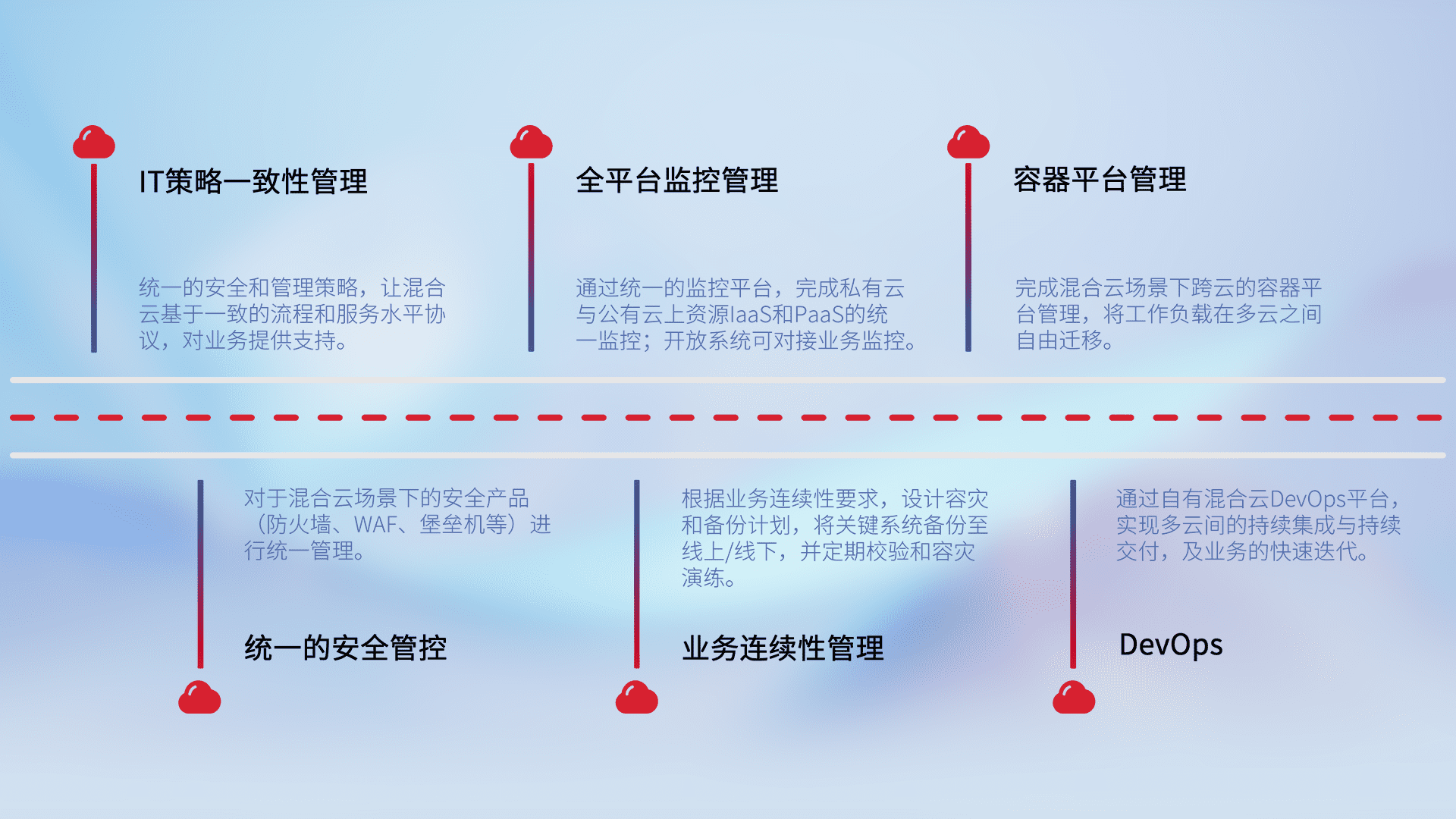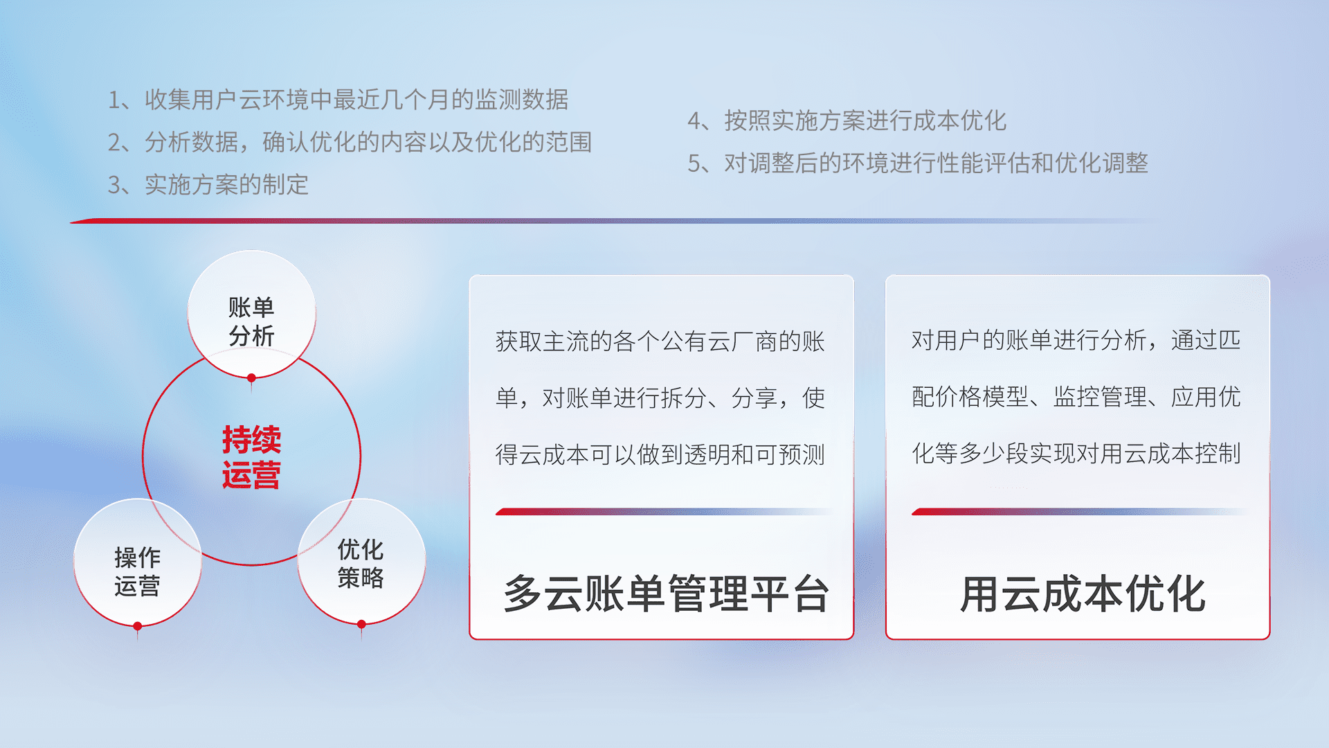 通过多云纳管,,,,以统一的资源数据模型把客户的云资源进行抽象和封装,,进而实现对多云资源的统一操作,,,,保障云资源管理的可靠性、、稳定性与可用性。。。量身定制化运维内容,,,配置、、开发运维、、、补丁管理、、、备份、、、监控、、、认证和访问管理、、、审计和日常巡检等,,,保障在用云过程中的可靠度,,稳定度以及高可用率。。。。